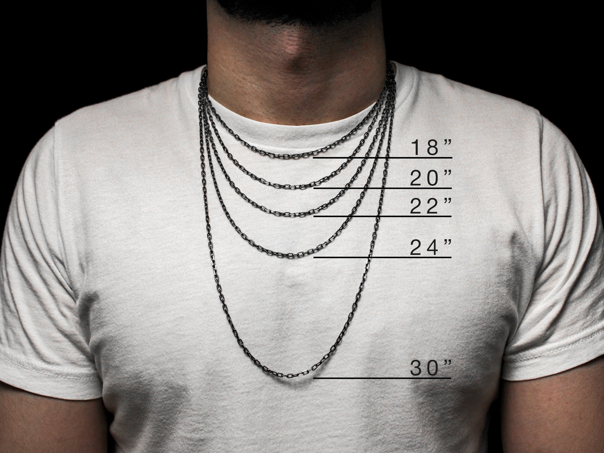 If you are uncertain about selecting an appropriate chain size, I recommend measuring a piece of string to determine the desired length. Place the string around your neck, aligning it with the chosen length, and assess in a mirror to ensure it hangs at the anticipated height.