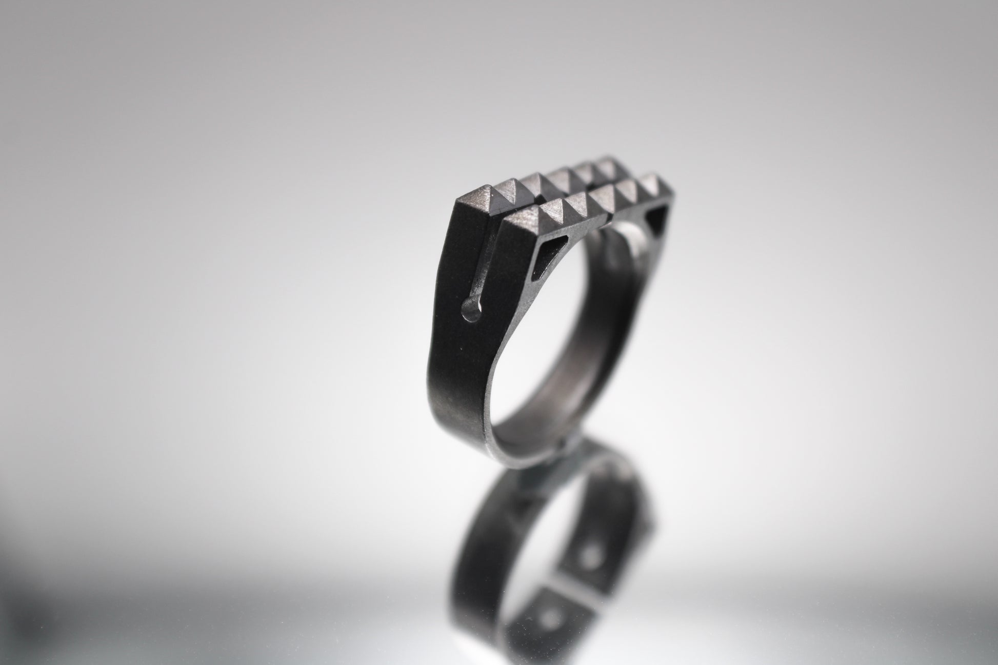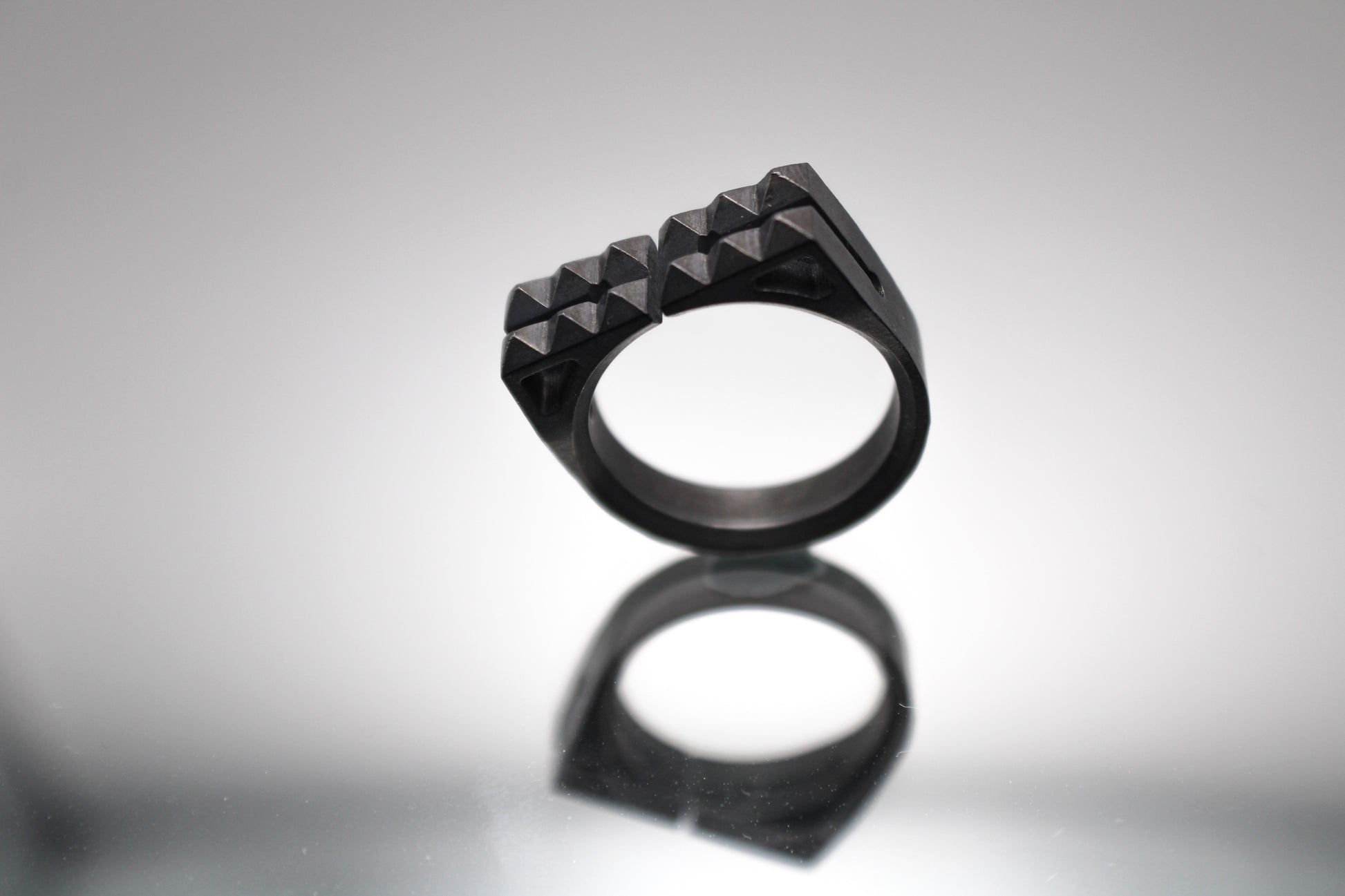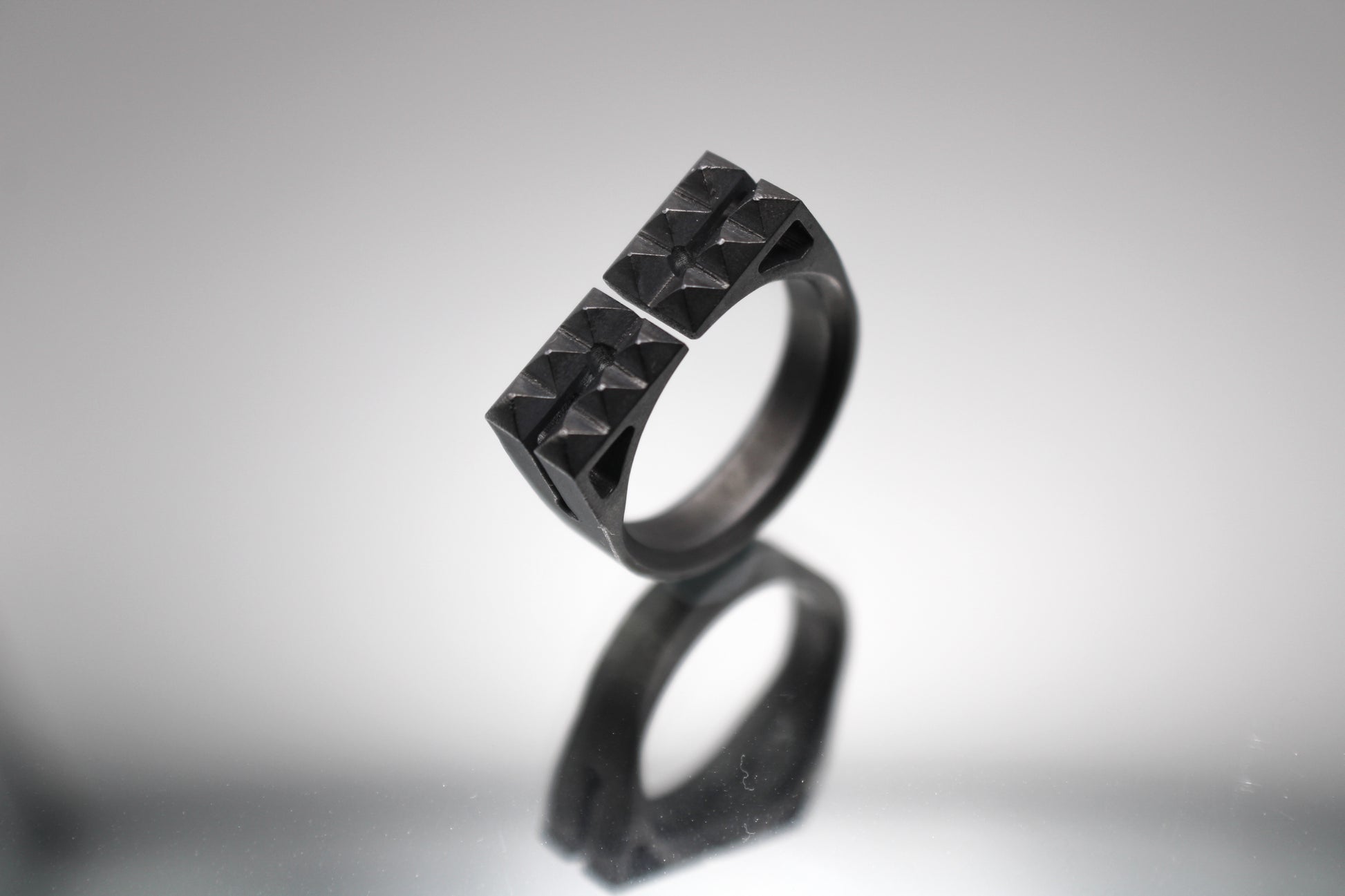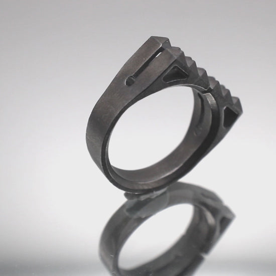 The Breach ring is a sophisticated accessory, specially crafted for men with a bold taste in jewelry. Inspired by the design of door breaching equipment, this ring features studs that are artfully arranged to resemble a tool. The ring's adjustable design and blackened brushed finish give it a sleek, stainless steel appearance, making it suitable for a variety of settings. The Breach ring can be worn on multiple fingers, adding versatility and functionality to your wardrobe. Whether you're looking for an accessory for everyday wear or a special occasion, this ring is a practical and eye-catching choice that is sure to impress.